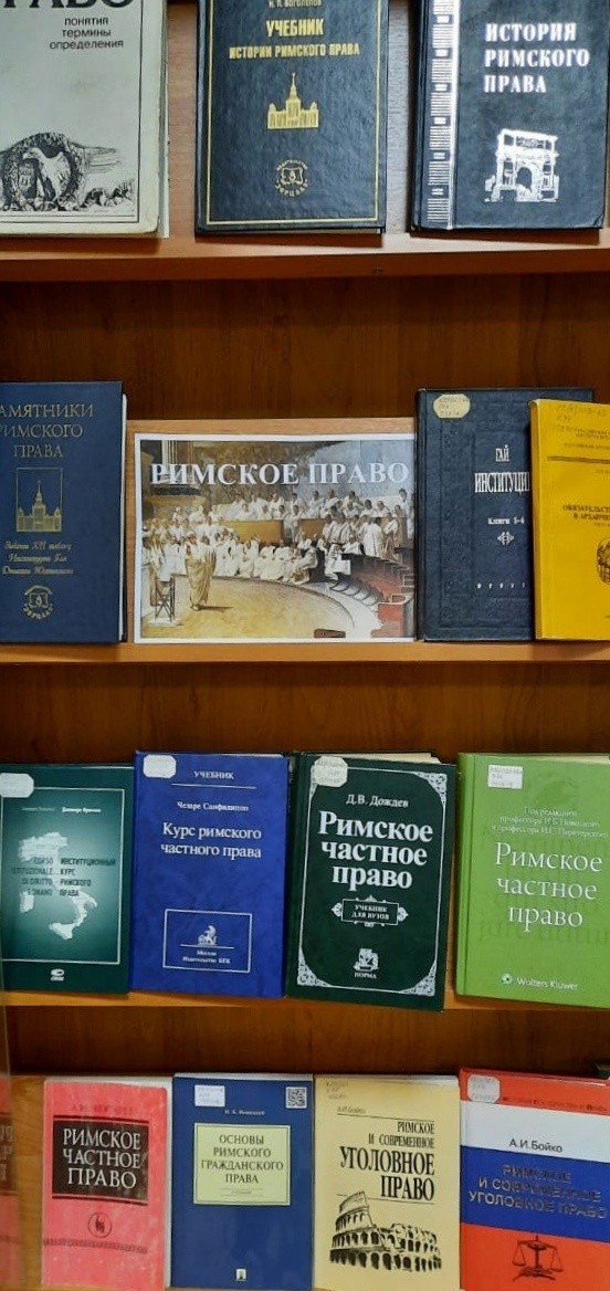 Литература, представленная на данной выставке, будет интересна преподавателям, студентам, начинающим изучать курс римского права и аспирантам юридического направления!